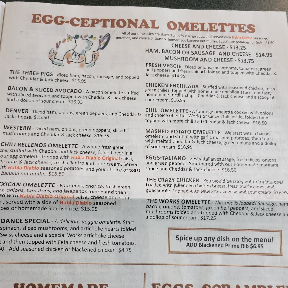 Four eggs, chorizo, green chilies, onions, tomatoes, and jalapenos folded and then topped with habla diablo original salsa, cheese and sour cream, served with a side of habla diablo seasoned potatoes or homemade Spanish rice.