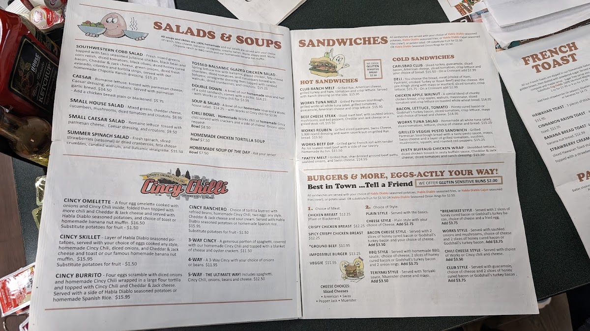 A bowl of our homemade soup and a small works house salad or caesar salad. With Works or Cincy chili for an additional charge.