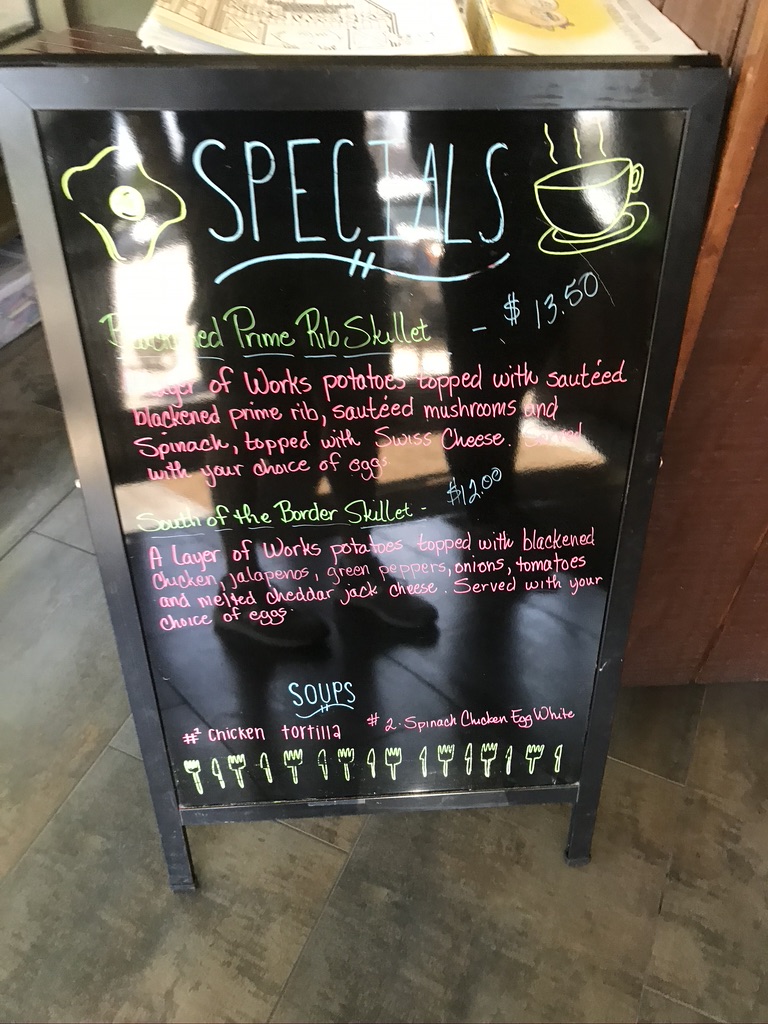 A warm flour tortilla stuffed with scrambled eggs, chicken, homemade chorizo, green chilies, onion and cheddar and jack cheese, then topped with our homemade Santa cruz sauce, topped with a dollop of sour cream served with a side of habla diablo seasoned potatoes or homemade Spanish Rice. Yummy. (*does not include Banana nut muffin)